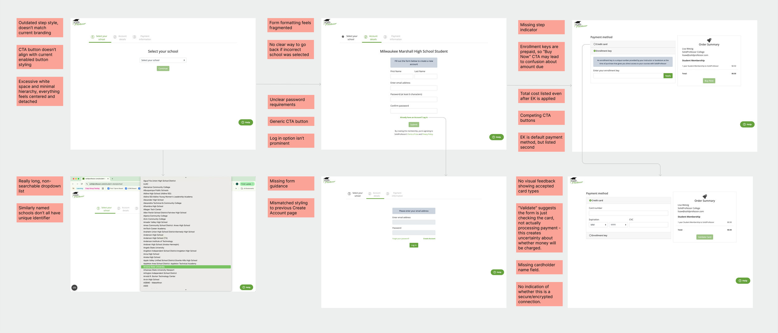 The legacy “student store” relied on a long dropdown of schools, offered limited functionality, and caused frequent errors. Students often purchased the wrong type of membership, leading to refunds and frustration.