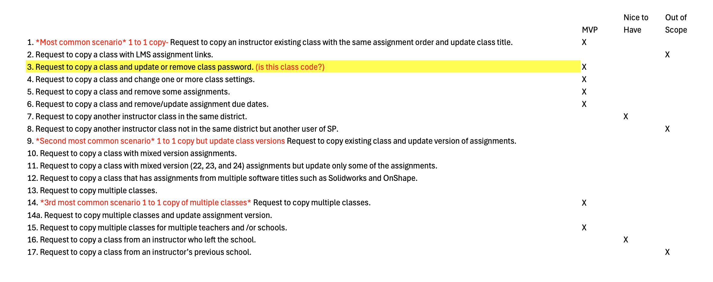 Prioritization matrix of copy class scenarios by instructor frequency and MVP scope