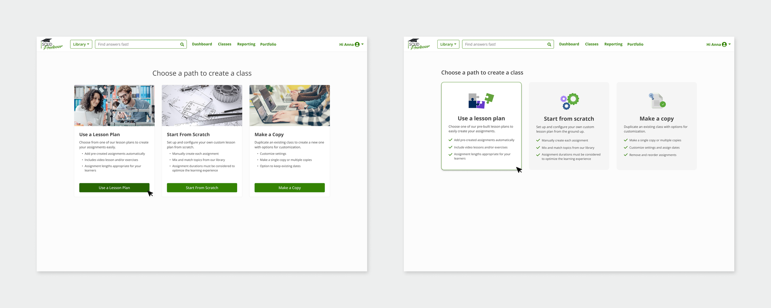 The button label “Create or Copy Class” caused hesitation during testing, as users weren’t sure if it would create or duplicate. We changed it to “Create” since both the breadcrumb and page heading already include “Classes,” providing context for users. The button color was also updated from orange to green to align with our platform’s primary action style, reinforcing visual consistency and meeting accessibility standards for color contrast.